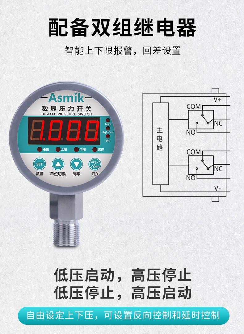 適用場(chǎng)合:數(shù)顯壓力開關(guān)設(shè)計(jì)為控制油壓、氣壓、水壓的兩路獨(dú)立的壓力監(jiān)控。并輔以報(bào)警方式選擇、密碼保護(hù),延時(shí)報(bào)警、誤差清零、采樣速率可調(diào)等功能,使該產(chǎn)品更準(zhǔn)確更智能的實(shí)現(xiàn)壓力報(bào)警和控制。