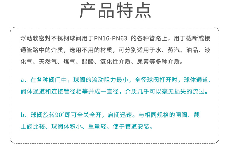 適用場合:不銹鋼球閥用于PN16-PN63的各種管路上,用于截斷或接通管路中的介質,選用不用的材質,可分別適用于水、蒸汽、油品、液化氣、天然氣、煤氣、醋酸、氧化性介質、尿素等多種介質。咨詢熱線:400-163-1718