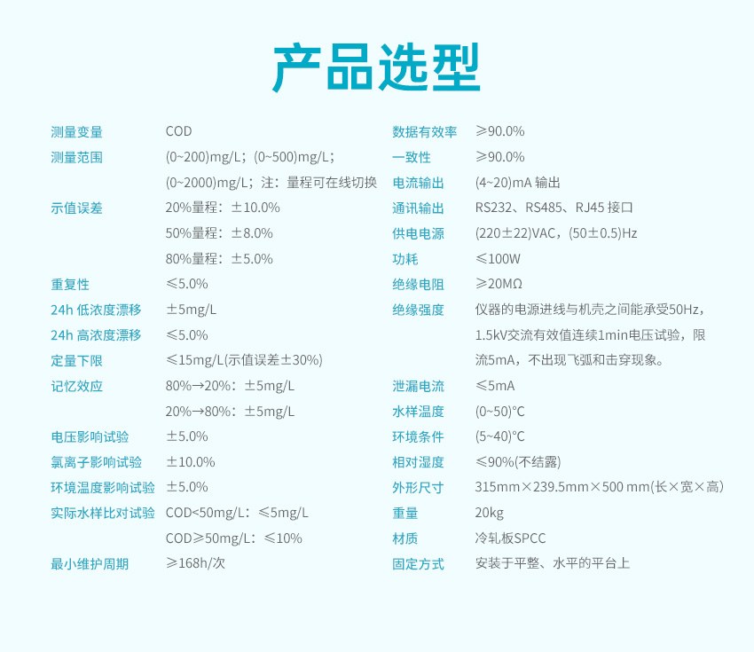 適用場合:COD水質在線分析儀采用重鉻酸鹽法檢測,符合《化學需氧量(CODCr)水質在線自動監測儀技術要求及檢測方法》(HJ 377)、《水質 化學需氧量的測定 重鉻酸鹽法》(HJ 828)和《水質化學需氧量的測定 快速消解分光光度法》(HJ/T 399)、《污染物在線自動監控(監測)系統數據傳輸標準》(HJ 212)、《地表水自動監測儀器通信協議技術規定》等標準和規范的要求。