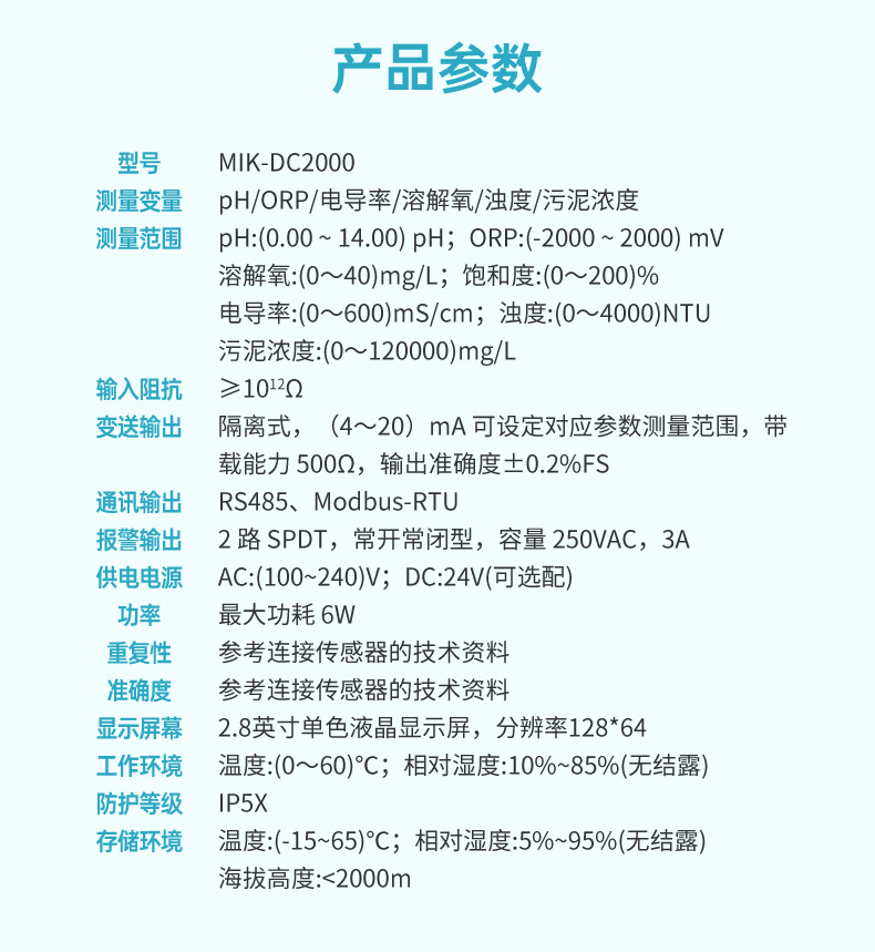 適用場合:本產品為水質通用型控制器,是一款智能在線化學分析儀器,廣泛應用于火電、化工化肥、冶金、環保、制藥、生化、食品和自來水等各個行業。通用型控制器與本公司多種水質系列數字傳感器配套使用,對溶液中的 pH、ORP、電導率、溶解氧、濁度、污泥濃度等水質參數進行連續監測。連續監測數據通過變送輸出連接記錄儀實現遠傳監控與記錄,也可以連接 RS485 接口通過 Modbus-RTU 協議與計算機通訊,從而實現計算機對儀表監控與記錄。