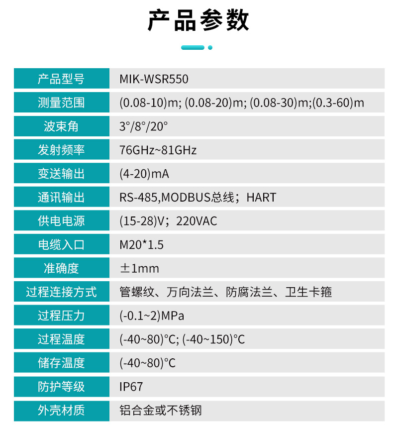 由于它工作頻率更高,波長更短,所以尤其適合固體應用,通過透鏡發射接收電磁波的工作方式,在高粉塵,惡劣溫度環境下(200°C)具有獨特的優勢。儀表提供法蘭或者螺紋的連接方式,使得安裝便捷簡容易