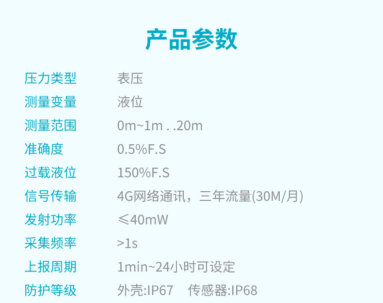 適用場合:無線投入式液位計是基于4G無線通訊網絡使液位的測量、變送、上報為一體的低功耗智能儀表,集成高靈敏度液位檢測元件,高精度信號調理電路,低功耗電池電源管理,豐富的LCD顯示界面于一體,周期性上報液位測量值、電池電量、信號質量等數據,并且能夠當液位超出設置范圍時及時報警,提前預警故障隱患。本產品適合油田、水利、消防管網、自來水管網、城市供熱管網等智慧城市應用場景。