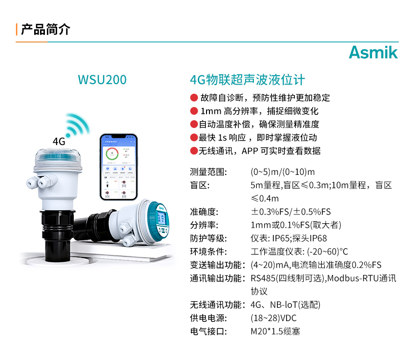 適用場合:WSU-200 4G物聯超聲波液位計具有高可靠性、高性價比、易安裝維護的液位/物位測量儀器,可廣泛用于各種液體和固體物料高度的測量。本產品可選配 NB-IoT 無線通訊功能,用戶可在儀表云平臺進行數據查看和遠程監控。常見的應用工況,如市政、化工、儲運等工業環境中的河流、水池、儲罐等液位測量。咨詢熱線:400-163-1718
