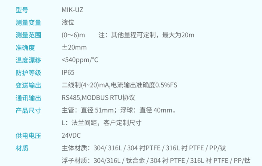 適用場合:米科MIK-UZ防腐款磁翻板液位計根據浮力原理,實現液位的指示。具有耐腐蝕、穩定性強、易操作的特點,適用于低溫到高溫、真空到高壓等各種環境,是化工溶液等場合理想的液位測量產品。咨詢熱線:400-163-1718