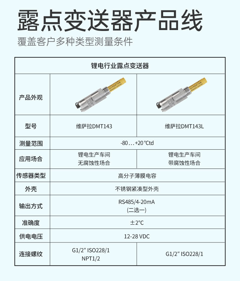 適用場合:米科露點變送器適用于新能源鋰電,干燥凈化,化工、石化、電力工程和食品藥業等,國產型及進口DMT143通用型、DMT143L抗污染型均可供貨